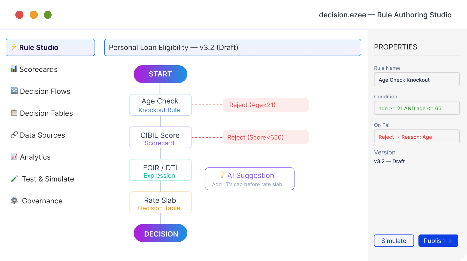 Upload credit policy docs. AI suggests knockouts, eligibility logic, rule structure. Drag-and-drop builder.