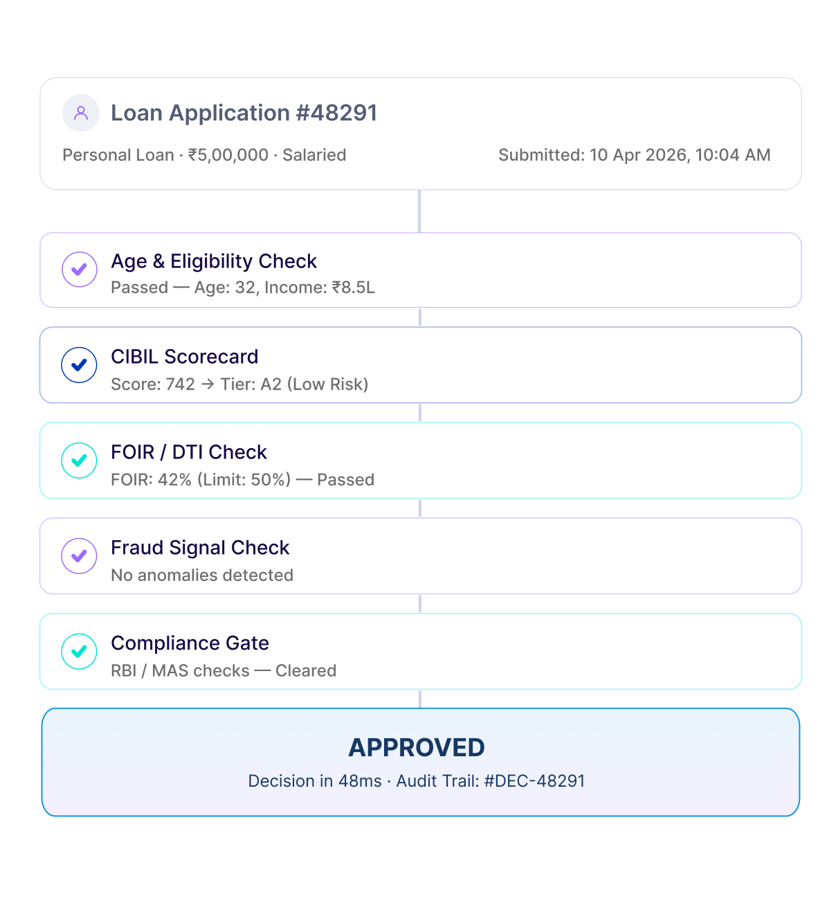 Master your risk logic. From simple rules to complex credit decision engine scoring, this credit decision engine software empowers business teams to iterate and deploy instantly.