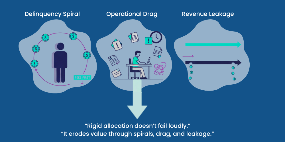 The Delinquency Spiral (Bad Debt Recovery Failure): Rigid allocation often prioritizes fee collection over principal reduction. For a struggling borrower, this means payments barely scratch the surface of the debt, leading to negative amortization and inevitable default. This pattern is the enemy of effective Bad Debt Recovery and inflates your NPL Management burden. A Liquidation Rate stuck at single digits signals systemic allocation failure.