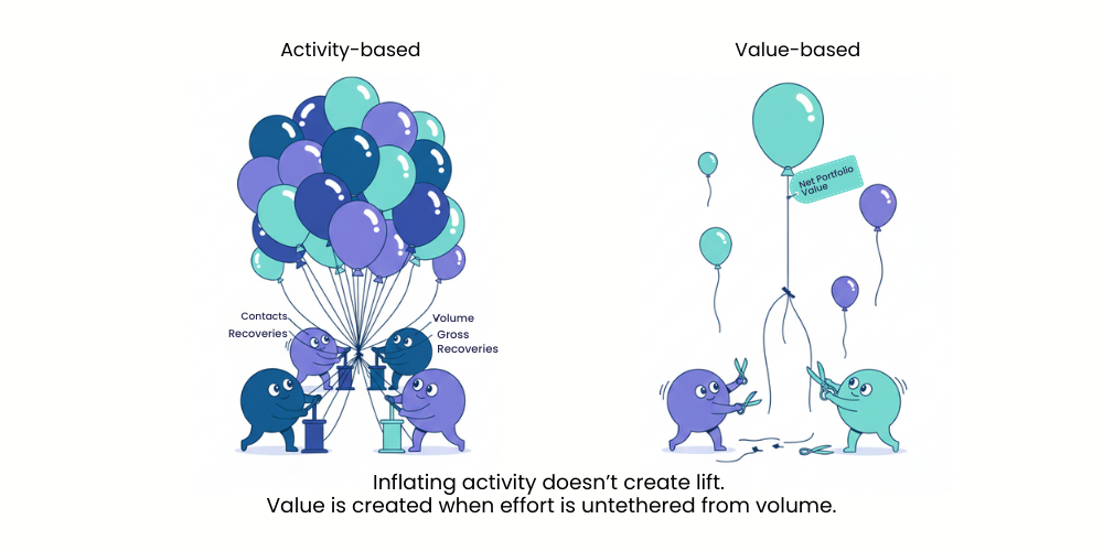 The structural problem deepens: Once lender compensation systems are built on this activity-based model, the institution develops organizational antibodies against changing it. Collections managers are promoted based on their ability to deliver collection volume. IT systems are built to measure contacts per collector, not net portfolio value per dollar of collections spend. Board reporting focuses on gross recoveries, not portfolio-adjusted returns.