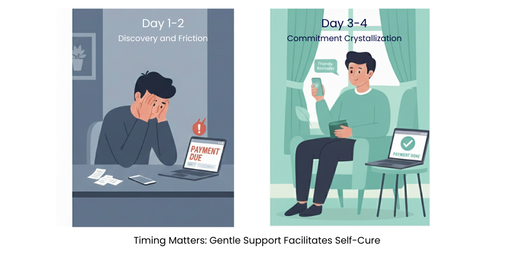 Day 3-4: Commitment Crystallization. The borrower has sat with the missed payment for a few days. Their cash flow improves (paycheck deposits, bill priorities re-adjust, a family member advances funds). Now, commitment devices activate. The borrower commits to repayment not because a collector convinced them, but because they have internally committed to resolving the debt. Research shows that borrowers who receive early gentle reminders not aggressive dialing campaigns show reduced roll rates (progression to 60+ DPD) while maintaining customer satisfaction. https://thedecisionlab.com/insights/consumer-insights/behavioral-science-of-paying-debts