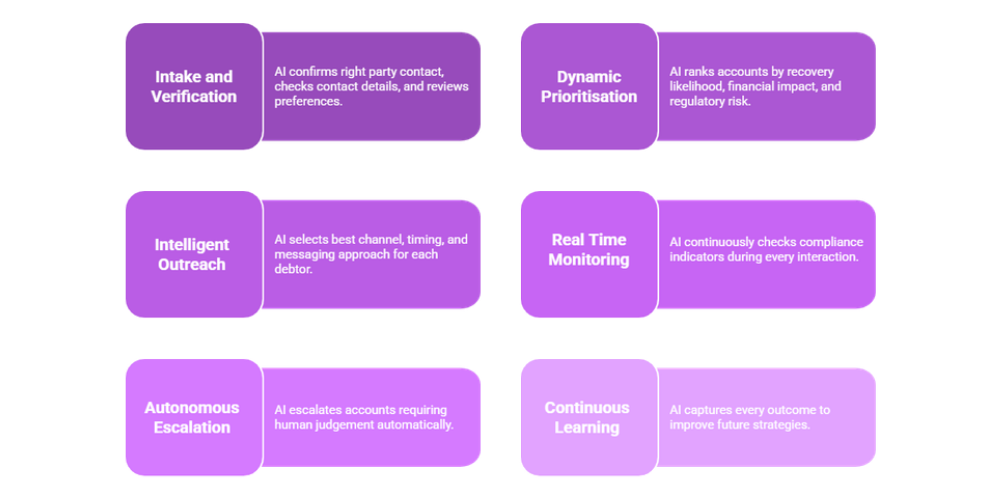 Agentic AI refers to autonomous systems that can understand context, plan multi step actions, adjust based on feedback, and continuously refine their strategies. In collections, this means the AI can prioritise accounts intelligently, orchestrate outreach dynamically, and monitor compliance in real time while keeping humans involved where judgment is essential.