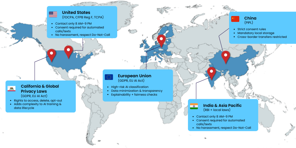 Multinational collections platforms face complex regulatory fragmentation. A single AI collections system deployed across the US, EU, India, and Southeast Asia must simultaneously comply with FDCPA, GDPR, PIPL, and localized regulations often with conflicting requirements.