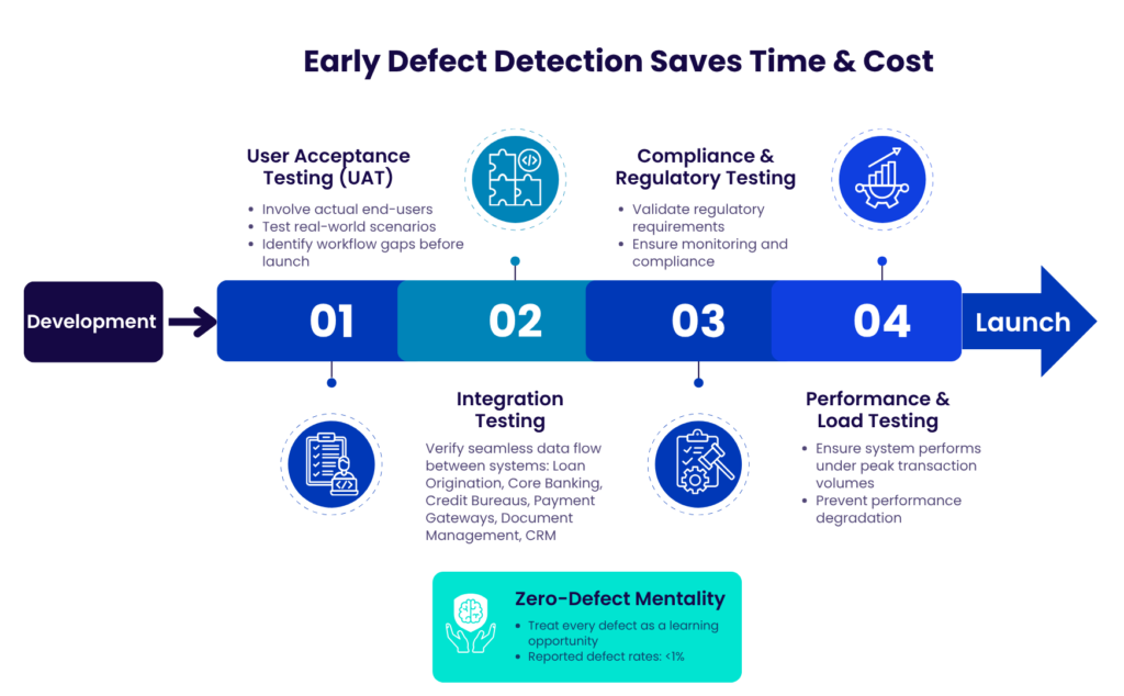 Integration Testing: Verify that information moves seamlessly between the Loan Origination System (LOS) and all linked platforms, such as the main banking system, payment processors, document storage, and Customer Relationship Management (CRM).